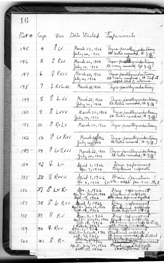 Logbooks: Each logbook comprises a month of numerical data on all animals in Richter's colony. Each page contains the monthly data for a given cage number (e.g., the logbook for January 1954 starts with a page for cage AR1, giving the numerical data for the animal in that cage for that month). The data in the logbooks vary according to experiment, but generally the following are recorded in columns: weight of the animal, running wheel totals, food intake, and water intake. By looking at several months of logbook data, one can chart the activity of individual animals in specific experiments.